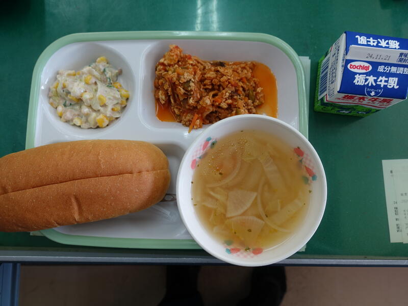 コッペパン、牛乳、スラッピージョー、ツナサラダ、和風コンソメスープ