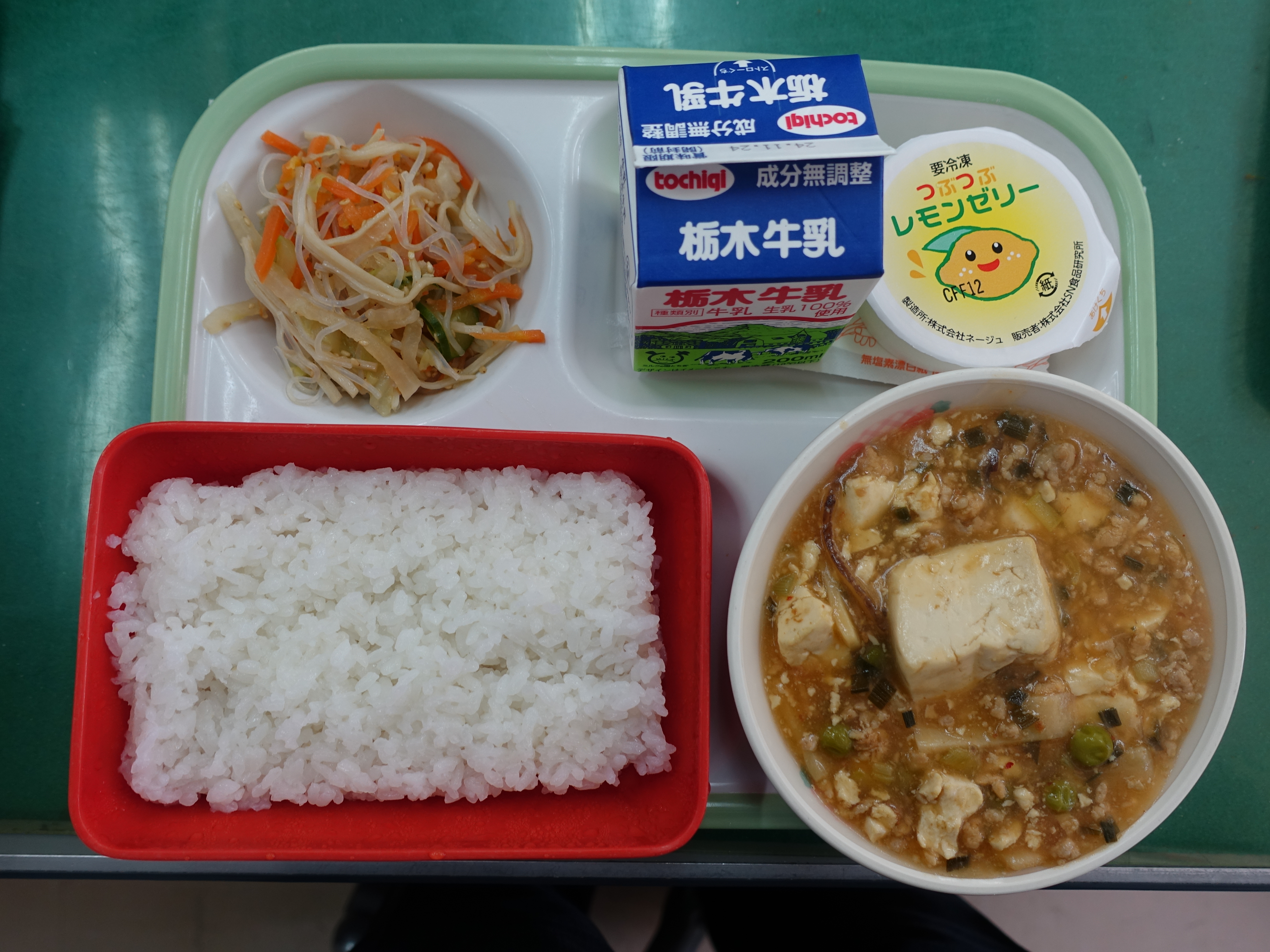 ごはん、牛乳、春雨サラダ、マーボー豆腐、つぶつぶレモンゼリー