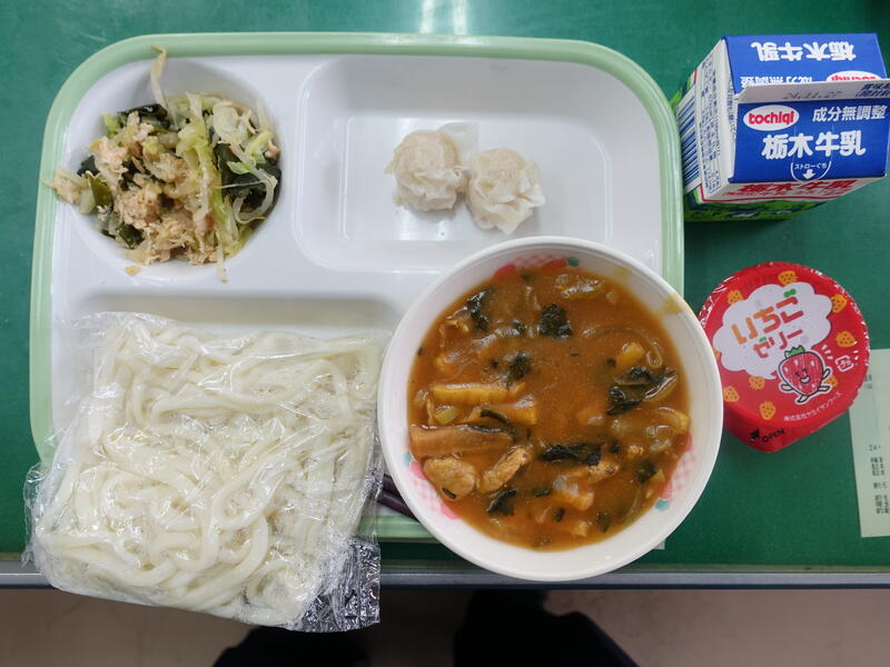 うどん、牛乳、えびしゅうまい②、とりとわかめのあえもの、カレー汁、いちごゼリー