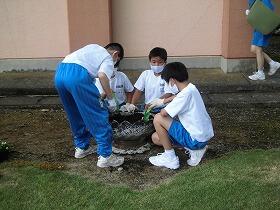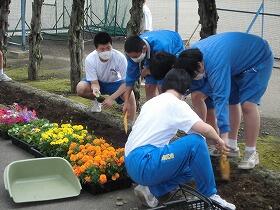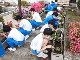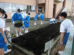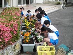 学級ごとに分担された場所に、みんなで協力してマリーゴールド、ペチュニア、ベゴニアを植えました。