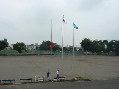 生徒会役員が、旗をすぐに降ろしています。