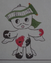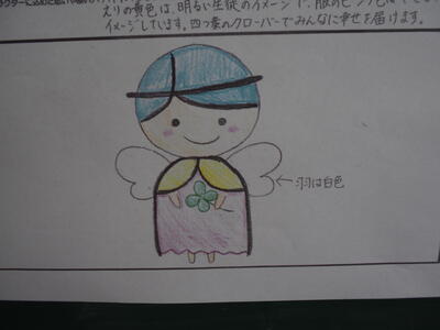 大内の文字を顔と体で表して、髪は五行川をイメージした水色、エリの黄色は明るい生徒のイメージ、服のピンク色はやさしい心をイメージしています。四つ葉のクローバーでみんなに幸せを届けます。