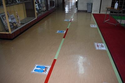 フィジカルディスタンスを意識するために昇降口にもステップを貼りました。