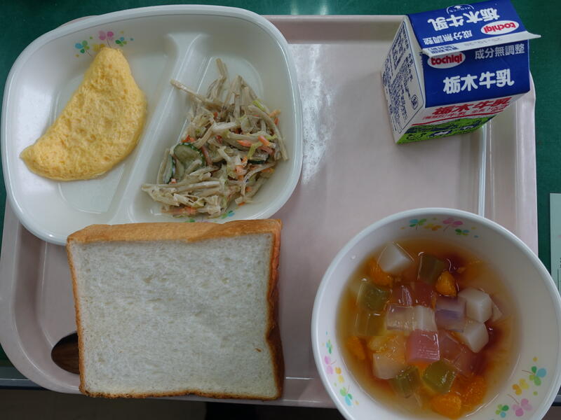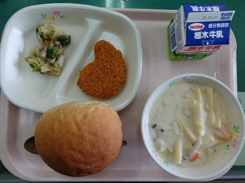 丸パン、牛乳、焼きチキンカツ、ブロッコリーとツナのサラダ、マカロニのクリーム煮