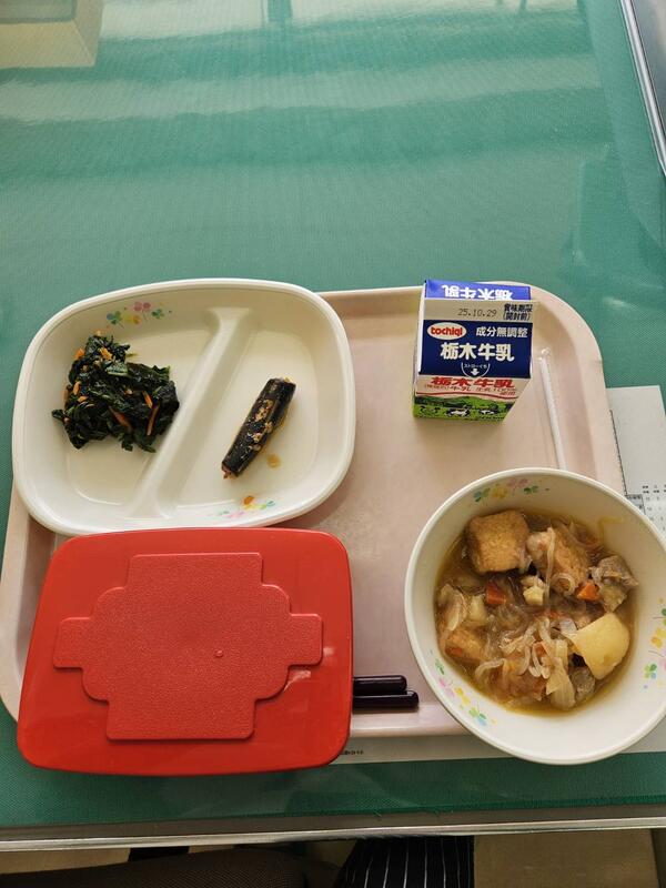 はちみつパン、牛乳、ごぼう入りバーグ、コールスローサラダ、ミネストローネスープ