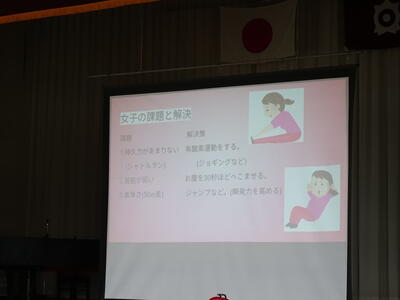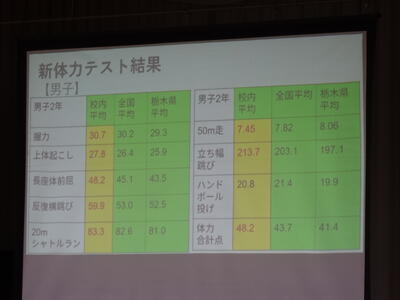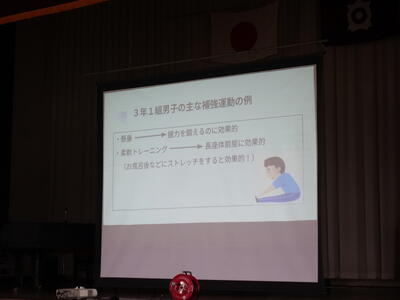 6月に実施した新体力テストの結果を学年ごとに分析し、それぞれの弱点を補うにはどのような運動が必要かを考え発表しました。
