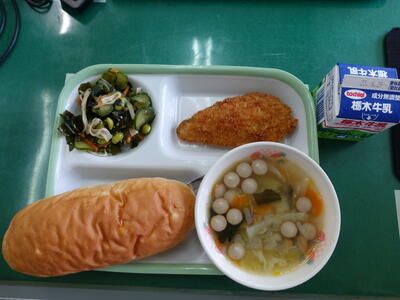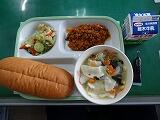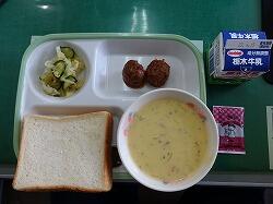 食パン、チョコ大豆、牛乳、野菜いろいろ肉団子②、ゆで野菜サラダ、コーンポタージュ