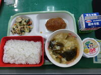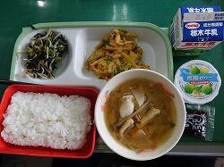 ごはん、のり佃煮、牛乳、TOFUナゲット③、ごまじゃこサラダ、巻き狩り汁