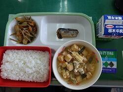 ごはん、のり香味、牛乳、いわしのみそ煮、五目きんぴら、にら入りかきたま汁
