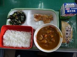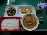 ごはん、牛乳、から揚げ、磯辺あえ、チキンカレー、チョコクレープ