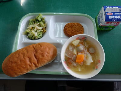 アップルパン、牛乳、焼き牛肉コロッケ、枝豆サラダ、ポトフ風スープ