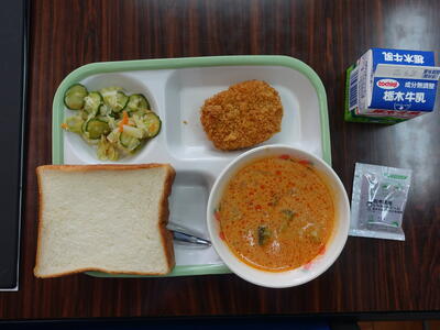 ミルク食パン、とちおとめジャム、牛乳、北海道野菜コロッケ、アーモンドサラダ、トマトクリームスープ