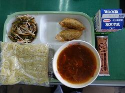 マーボーラーメン、牛乳、揚げぎょうざの甘酢かけ2個、茎わかめのナムル、ウエハースココア