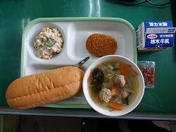 コッペパン、レモンハニー、牛乳、肉団子2個、ブロッコリーサラダ、クリームスープ