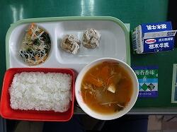 ごはん、牛乳、揚げてんぐにらまんじゅう、青椒肉絲、えび団子スープ