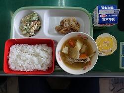 ごはん、牛乳、とりのから揚げ、マカロニサラダ、豚汁、レモンゼリー