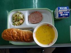 パインパン、牛乳、ソーセージステーキ、かんぴょうサラダ、かぼちゃのポタージュ