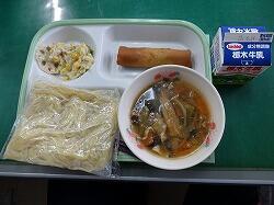牛乳、春巻、チキンとれんこんのサラダ、みそラーメン