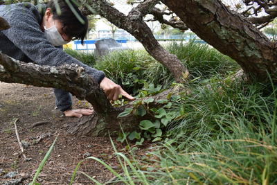 まず、昇降口前の松の木の下で、ある植物を発見しました