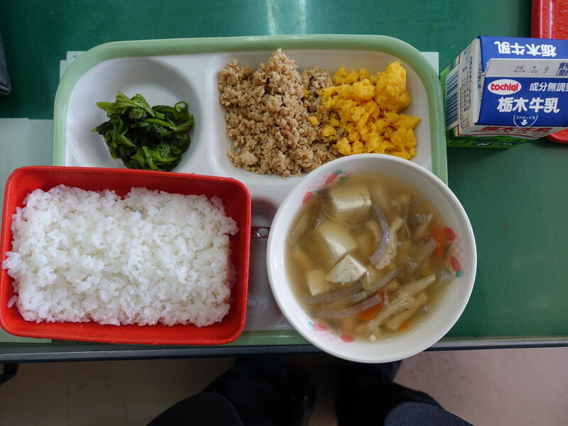 三色ごはん(鶏そぼろ・卵そぼろ・ほうれん草)、牛乳、のっぺい汁