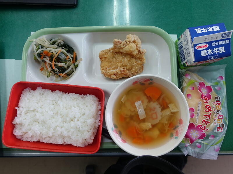 ごはん、牛乳、とりのから揚げ、磯辺あえ、カレー、チョコクレープ