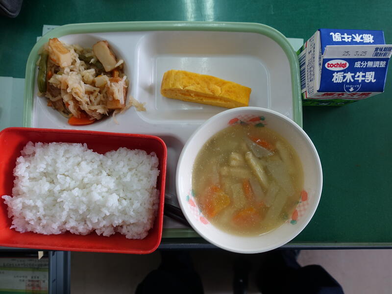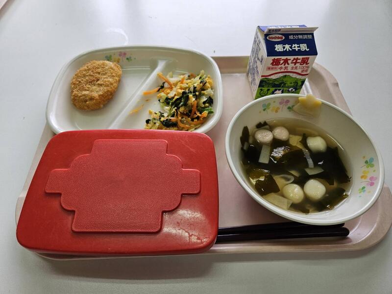 ごはん、牛乳、国産カツオカツ、野菜と卵のあえもの、若竹汁