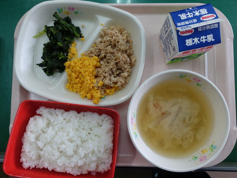 三色ごはん(鶏そぼろ・卵そぼろ・ほうれん草)、牛乳、豆乳仕立ての野菜汁