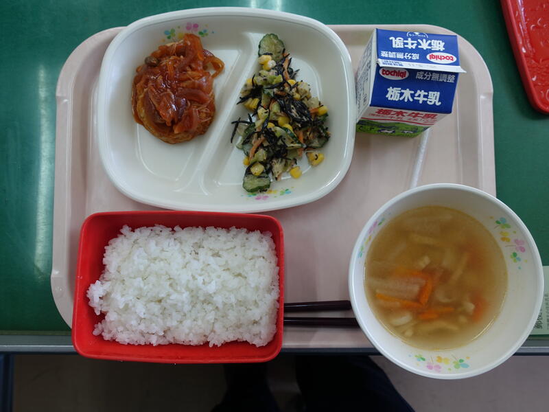 ごはん、牛乳、ぎょうざの甘酢あんかけ②、のりごまあえ、えび団子のスープ