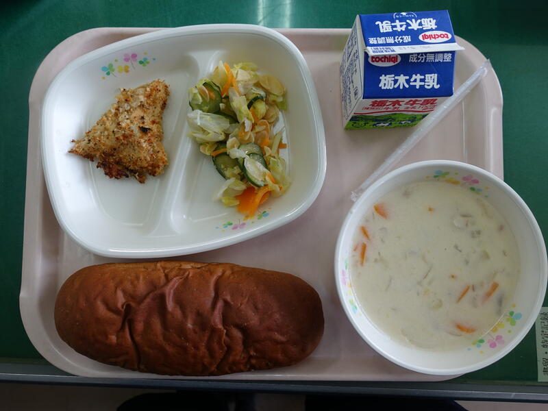 黒糖コッペパン、牛乳、とり肉の香草焼き、アーモンドサラダ、クラムチャウダー