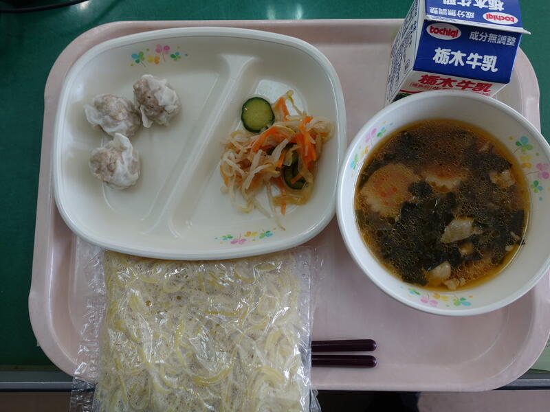 みそラーメン、牛乳、ポークしゅうまい②、くらげサラダ