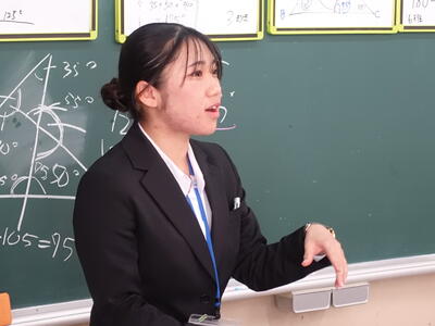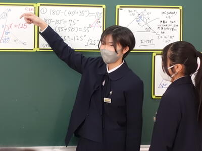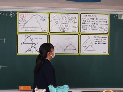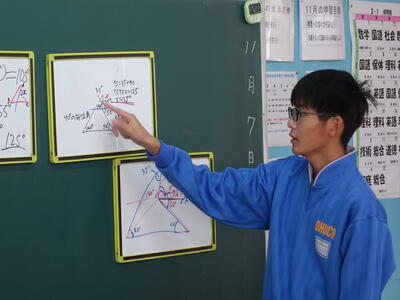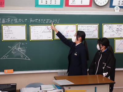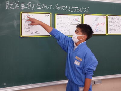 角度の求め方を、グループそれぞれの考え方でまとめ、代表の生徒が分かりやすく発表しました。