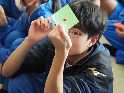 光の進み方を作図し、水の中の硬貨が浮かんで見える現象を考えました。