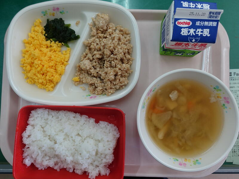 三色ごはん(鶏そぼろ・卵そぼろ・ほうれん草)、牛乳、豚汁