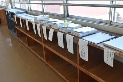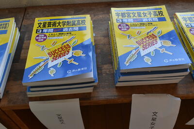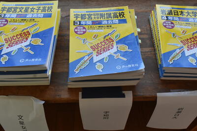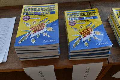 教室前の廊下には、高校ごとの過去問題集を置き、貸し出しています。