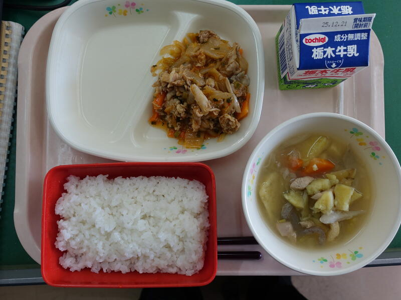 セルフ豚キムチ丼、牛乳、さつまいも汁