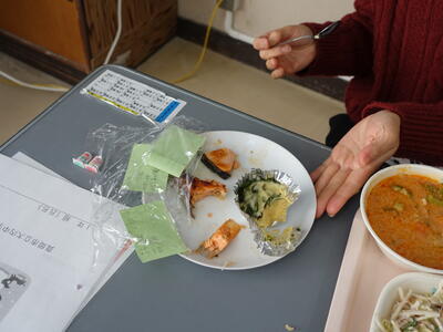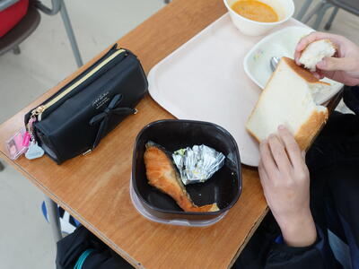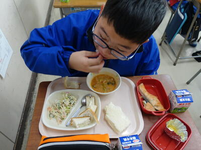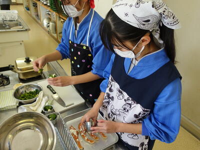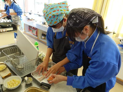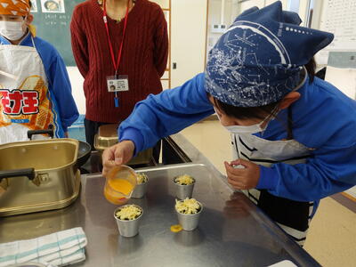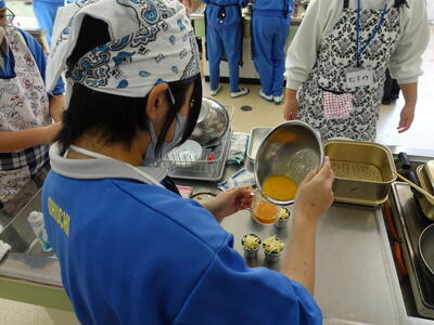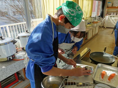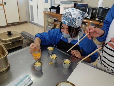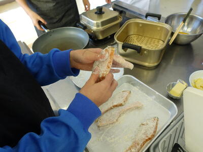 鮭の水分を取って小麦粉をまぶしたり、卵を混ぜてカップに注いだり、ボランティアの方の支援もあり、スムーズに調理することができました。
