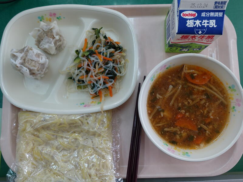 ラーメン、牛乳、肉しゅうまい②、もやしと青菜のナムル、マーボーラーメンスープ