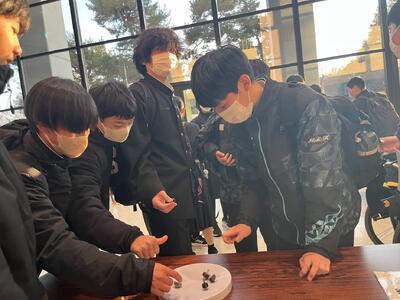 写真は発表会後、展示物を見ているところです。