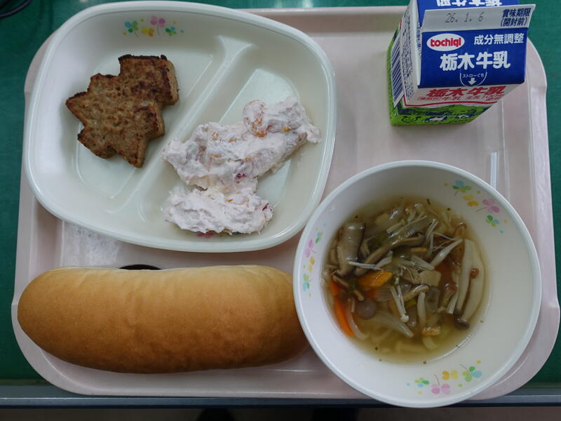 コッペパン、牛乳、もみの木ハンバーグ、フルーツクリーム、きのことベーコンのスープ