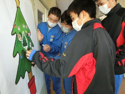クリスマスにちなんで、生徒会の企画でクリスマスツリーに生徒や先生方に飾り付けをしてもらいました。