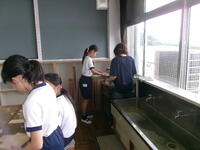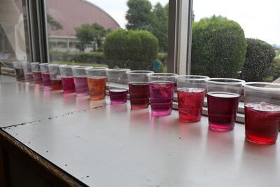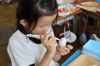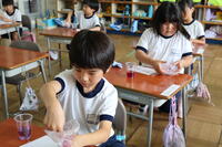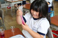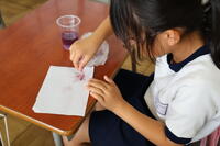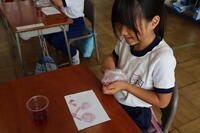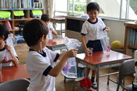 1年生の図工の時間に、朝顔で色水づくりをしました。
