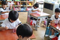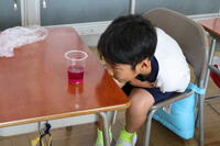 色水をコップに入れて見たときに、「ジュースみたい!」「おいしそう!」と楽しんでいました。