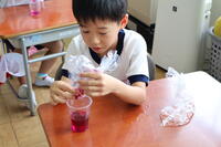 出来上がった色水を使って絵も描いてみました。色が薄くて紙に描けないことから、「もっと花を入れれば、色が濃くなるかも」と気付き、花を多く袋に入れて、濃い色水を作ることができました。2回目には、無事に絵を描くことができました。