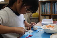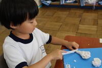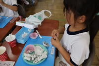 自分の好きな食べ物を作ったり、今食べたいものを考えて作たりしました。出来上がった作品を見てみると、クレープやケーキ、たこ焼きなど本物そっくりなものもあり、日々の生活の中でよく見てるなと感心しました。