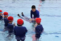全校児童で行いました。「ラッコクラブ」の方々に教えていただきました。その中で、児童たちは、救助を浮いて待つことが一番大切だということを学びました。