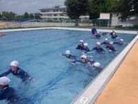 今日は、着衣泳を行いました。万が一川などで流されてしまったときに、自分の命を守るための訓練です。