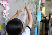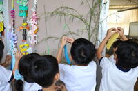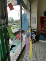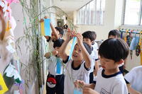 休み時間には、高学年の児童が昇降口の笹の葉に、楽しそうに願い事を書いて、短冊を飾っていました。