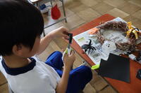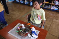 根本山自然観察センターでは、秋の色づいた葉や木の実を採り、おもちゃを作りました。ドングリに穴をあけることが難しかったようですが、やじろべえやこまを上手に作っていました。