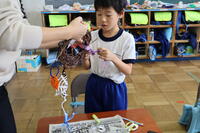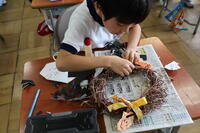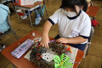 1年生の生活科で昨日と本日の2日間、アサガオのつるを使って、ハロウィンのリースを作りました。