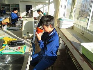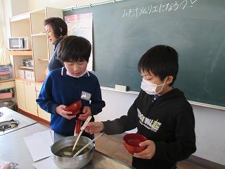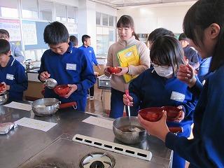5年生の家庭科「ご飯とみそ汁」の学習で、だし汁4種の特徴を比べました。かつお節、にぼし、こんぶ、顆粒だしのにおい、色、味などを比べました。「全然違う!」と驚きの声を上げながら、確かめていました。次に、米味噌と豆味噌を比べ、自分の好みを伝え合っていました。みんな「みそ汁ソムリエ」になれそうですね。このような実感を伴った学びを通して、意欲が高まっていきます。
